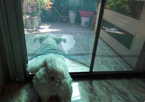 그런 생활을 이어가다가 아롱이는 2017년 여름에는 현관 방충망에 커다란 구멍을 내고 말았습니다. 더운 여름 날씨에 아줌마는 땀을 뻘뻘 흘리면서 방충망을 수리했는데... 수리된 방충방마저 뚫어버렸고 그날부터 지금까지 아롱이는 아무런 거리낌 없이 방충망을 뚫고 집안으로 들어왔다 나갔다를 자유자재로 하고 있습니다.