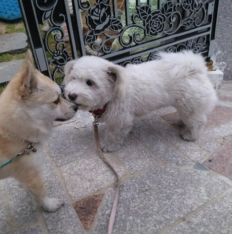 담이는 저 아롱이와 같은 동네에 살고 있는데, 가족들이 모두 외출을 하는 낮이면 담이 혼자 집안에만 있어야 하기 때문에 저 아롱이와 쉽게 만날 수 없는 환경이랍니다. 가족 중 누군가의 도움으로 산책을 하는 도중에 담이는 아롱이 집 대문 앞을 서성이고는 했습니다. 결국 저 아롱이가 아줌마와 산책을 나갔다가 담이의 집을 찾아가서 서로 얼굴을 마주하게 되었지요.