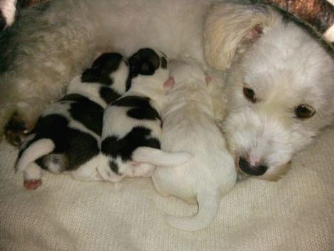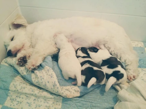 3남매를 낳을 때 새끼들을 혀로 열심히 핥아 주면서 아롱이 입 주변이 온통 빨간 피로 물들어버렸습니다. 그런 아롱이의 모습도 아줌마의 마음을 아프게 했다고 합니다.