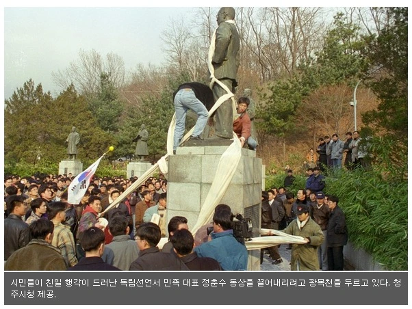 정춘수 목사의 친일 행적이 알려지기 전인 1980년, 충북 시민사회는 우암산 기슭 삼일공원에 정춘수 목사를 포함한 지역 출신 민족대표 6인의 동상을 건립했다. 오른쪽 끝에 버젓이 서 있던 정춘수 목사의 동상은 1996년 충북지역 시민들에 의해 강제로 철거되었다.