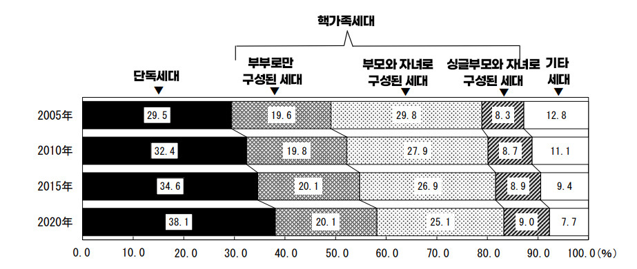 일반 세대 가족종류별 비율 추이 (2005년 ~ 2020년)