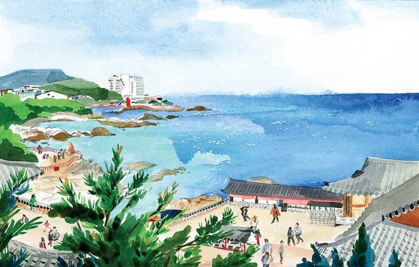 소원을 빌고 뒤돌아서서 바라본 바다 풍경은 푸르렀고 시원했다. 내 마음까지도 탁 트일 것만 같았다. 코발트 빛 푸른 바다와 잔잔한 파도, 시원한 바람, 저 멀리 보이는 빨간 등대와 작은 산, 절에서 바삐 움직이는 사람들까지도 모든 게 다 하나하나 새롭고 예뻐 보였다. 거기다 날씨도 좋으니 얼마나 완벽한지. 역시 사찰이 있는 풍경은 조용히, 멀리 봐야 더 예쁜 것 같다며 혼자 고개를 끄덕거렸다. 나는 한동안 그 자리에 서서 혼자 풍경을 만끽했다.