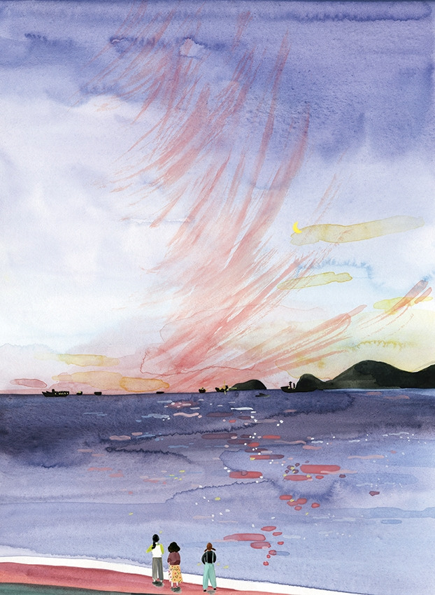 각자 보폭대로 걸어가고 있는데, 디랜다가 저기 보라며 하늘을 가리켰다. 깃털 구름이 노을 따라 붉게, 분홍빛을 내며 연기처럼 피어오르고 있었다. 아기 손톱처럼 작게 생긴 초승달도 구름 옆에서 빼꼼 얼굴을 드러냈다. 부산에서 본 노을은 어찌나 다 이렇게 예쁜지. 멋진 풍경에 마음 한편이 꽉 차올랐다.