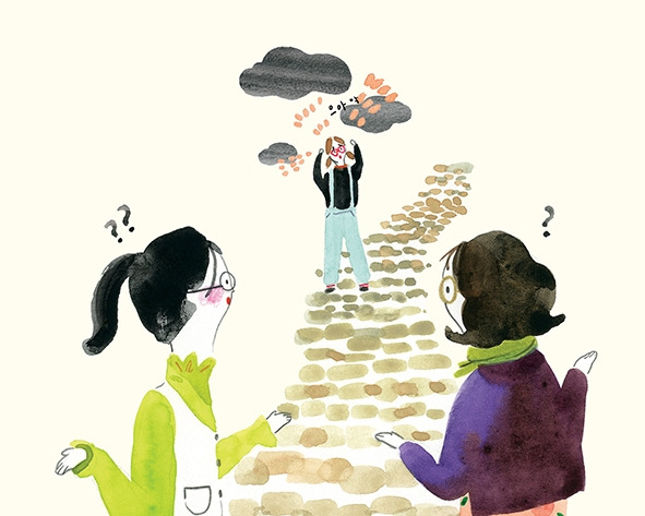 뭔 일인가 싶어 뒤돌아보니, 초키가 부들부들 손을 떨며 우리에게 손잡아달라는 듯 한쪽 손을 쭉 내밀고 있었다. 아까 걸을 때만 해도 제일 먼저 앞장서서 잘 걷던데, 왜 그런가 싶어 멍한 표정으로 초키를 바라봤다. 예전에 초키에게 들었던 게 생각났다. 가파르고 울퉁불퉁한 곳이라면(특히 산이나 계단이라면) 무섭다고, 싫다고는 누누이 들었지만, 초키가 이 정도 계단도 무서워할 줄은 예상치도 못했다. 나도 이 계단 힘들다고는 생각했는데, 초키는 오죽할까 싶었다. 디랜다와 나는 말없이 서로 마주 보다, 초키에게 다가가 초키 손을 잡고 한 발짝씩 천천히 내려왔다.