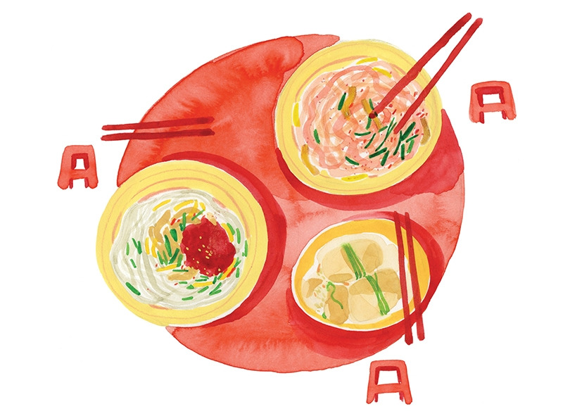 출출한 배를 채우기 위해 깡통시장을 가기로 했다. 주전부리와 먹거리가 많은 곳이라고 예전부터 들었던 터라 한껏 기대가 가득 찼다. 저녁 늦게 도착했던 터라 문 닫은 가게가 많이 보여서 아쉬웠지만, 분식집과 음식점은 아직도 사람들로 붐볐고, 문 닫기 전에 와서 다행이라 생각했다. 초키는 비빔당면을, 나는 물떡을 꼭 먹어보고 싶다고 이야기했는데, 우리가 그 메뉴만 찾아봐서 그런지 몰라도, 시장에는 어묵과 비빔당면, 떡볶이 종류만 많이 보였다. 한 블록도 안가 분식집들이 여럿이 모여있으니, 어디가 맛있는 집인지도 모르겠고, 어딜 가야 할지도 몰라 한참을 길가에서 망설였다. 발길이 닿는 대로 무작정 걷다가 사람이 조금 있어 보이는 분식집에 들어가 자리를 잡았다. 초키와 디랜다는 비빔당면을 시키고 나는 유부 주머니를 하나 시켰다. 음식이 나오고, 나는 습관대로 손을 머리 위로 올려 사진을 한 컷 찍었다. 비빔당면을 터프하게 비비던 초키는 잠시 흠칫거리다 이내 젓가락을 살포시 내려놓았다. 역시나 이번에도 사진 찍는다며, 초키는 나와 디랜다를 보며 호탕한 웃음소리를 냈다.