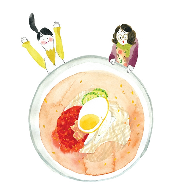 밀면이 나오고, 국물부터 한 입 먹어보는데 고기 육수 맛이 진하게 올라왔다. 냉면처럼 살얼음은 없었지만, 시원하고 달콤한 맛이 입안을 가득 채웠다. 예전에 다른 가게에서 먹어봤던 밀면과는 조금 다른 맛이 있었는데, 취향에 따라 좋고 싫음이 확연하게 구분될 것 같았다. 면도 쫄면처럼 어찌나 두툼하고 쫄깃한지, 후루룩 한 젓가락 할 때면, 입안은 온통 면으로 가득 차서 빨리 씹기 다급했다. 빨간 양념에 든 양파가 가끔 살짝 씹힐 때면 상쾌한 향과 맛이 입안 가득 퍼졌다.