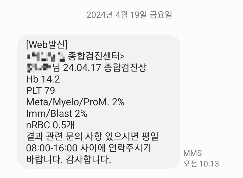 [24.04.17 종합검진상 Hb 14.2 / PLT 79 / Meta/Myelo/ProM. 2% / Imm/Blast 2% nRBC 0.5개. 결과 관련 문의 사항 있으시면 평일 08:00-16:00 사이에 연락 주시기 바랍니다.]