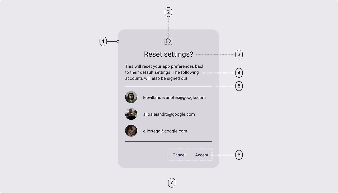 모달의 구성요소는 사용자에게 중요한 정보를 전달하고, 명확한 선택을 유도하기 위해 다음과 같은 요소로 구성됩니다.
