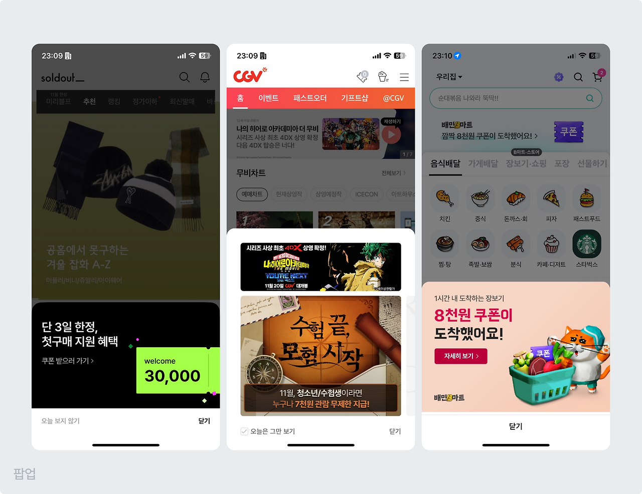 웹과 달리 모바일 환경에서는, 팝업이 페이지에 종속된 창의 형태를 지니는 경우가 많습니다. 그러나 다른 브라우저를 보여주거나 다른 페이지로 이동시키는 특성, 페이지에 접속하자마자 발생하는 특성으로 인해 팝업으로 분류되는 경우가 많아 보입니다.