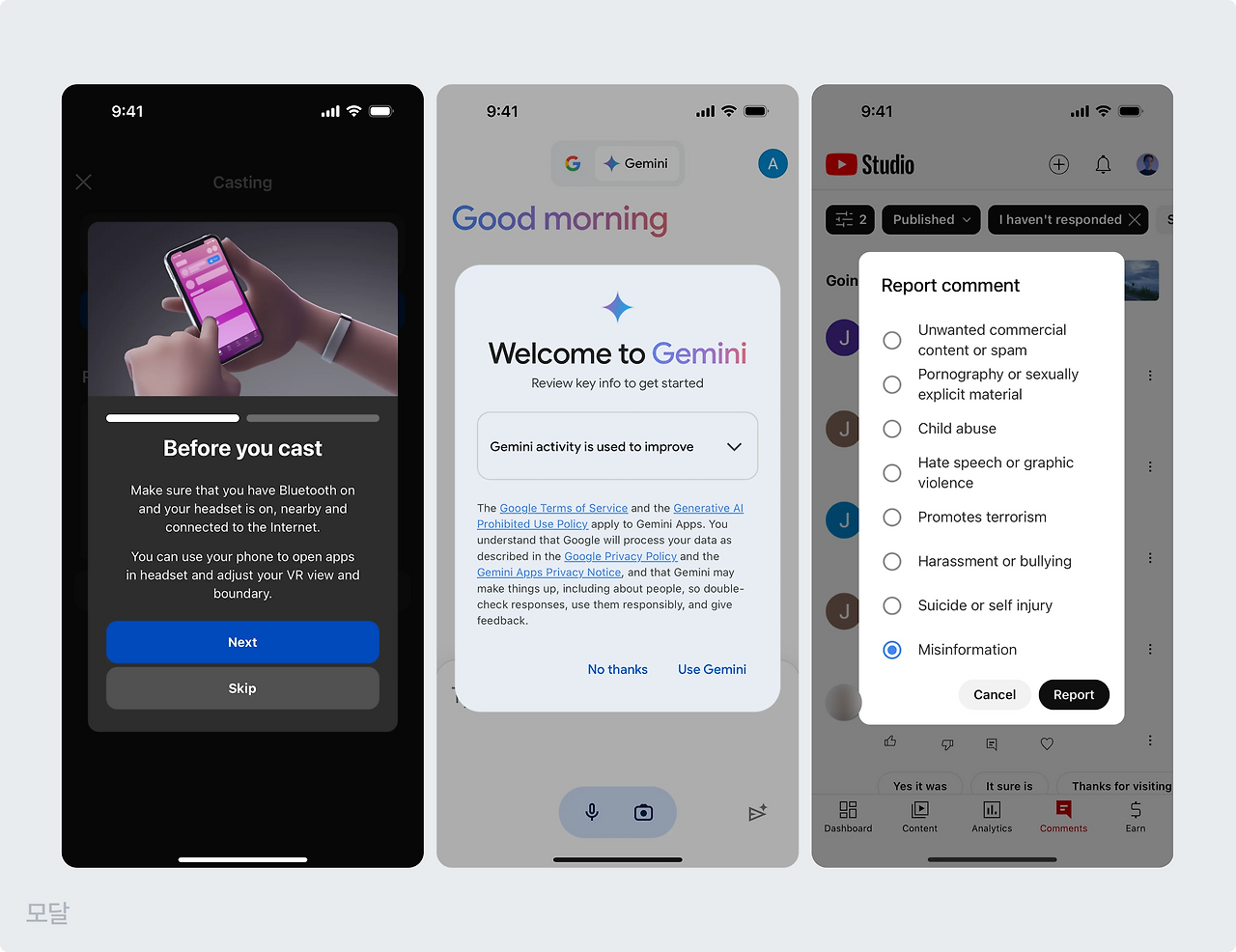 모달(Apple)과 다이얼로그(Google)는 일반적으로 같은 의미로 사용됩니다. 현재 페이지 내에서 사용자와의 상호작용을 위해 나타나는 작은 창으로, 주로 의사결정이나 입력을 요구합니다.