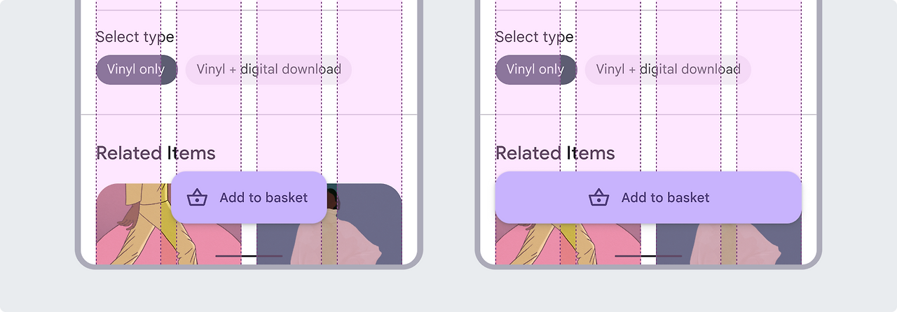 확장형 FAB 컨테이너의 너비는 고정되거나 유동적일 수 있습니다. 유동적인 폭의 컨테이너는 화면 너비나 레이아웃 그리드와 같은 화면 크기와의 관계에 따라 정의됩니다.