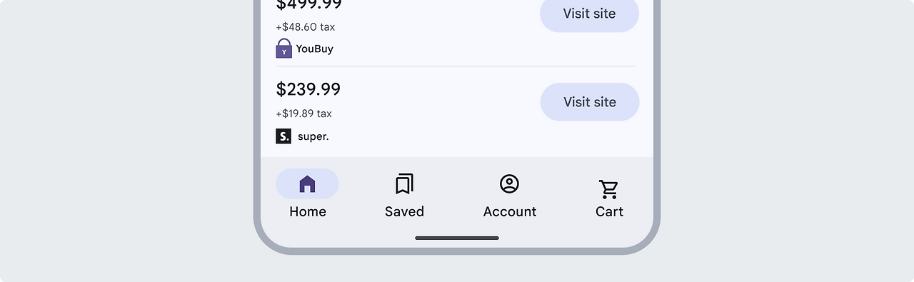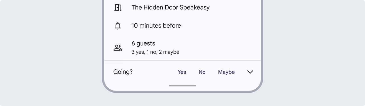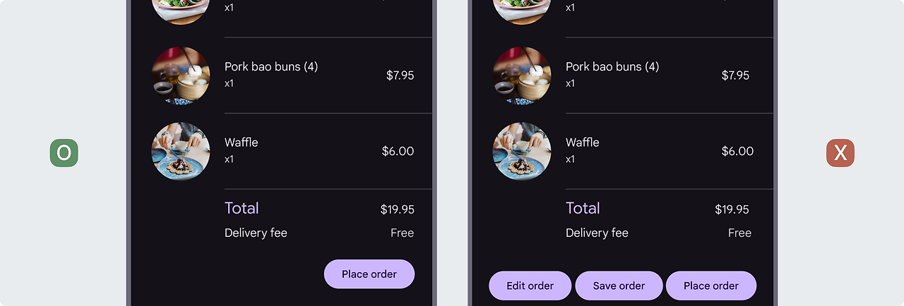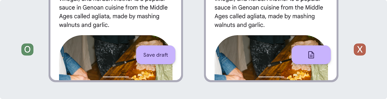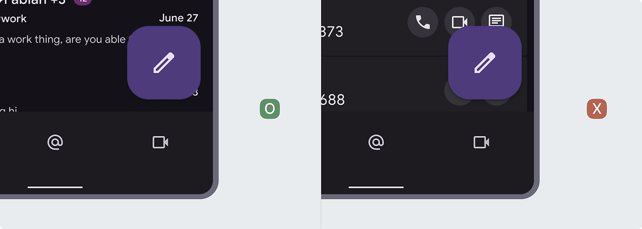 액션에 대한 지속적인 액세스가 필요한 길고 스크롤되는 뷰가 있는 화면에서는 확장형 FAB을 사용합니다. 스크롤할 수 없는 뷰에서는 확장형 FAB을 지양합니다.