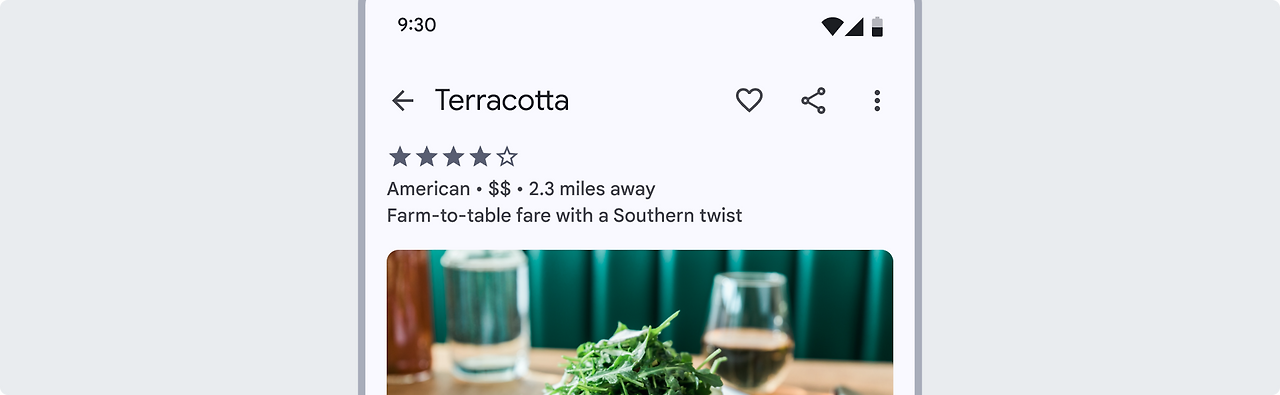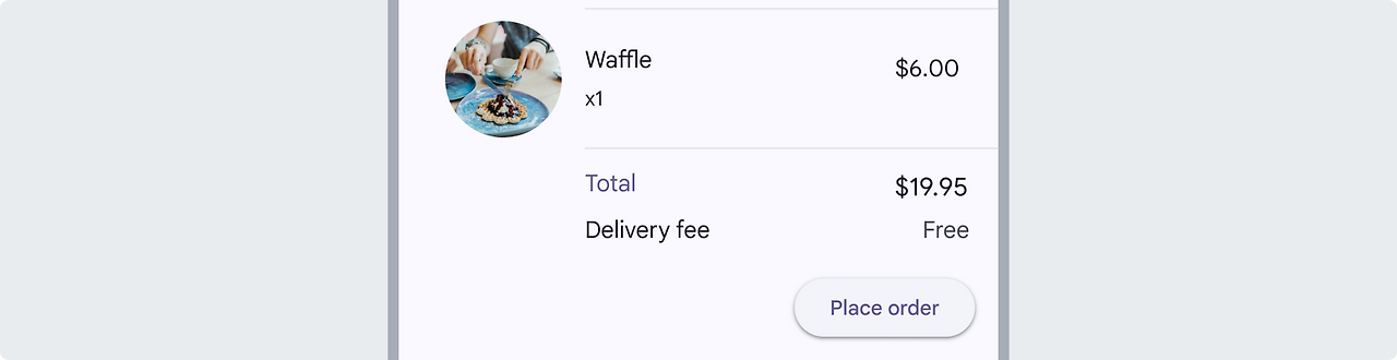 앱 바에 FAB을 겹치면 안 됩니다. 이는 엘리베이션과 표면 레이어의 일관성을 방해합니다. 확장형 FAB을 앱 바와 같은 요소에서 떨어진 나머지 UI 위에 배치해야 합니다.