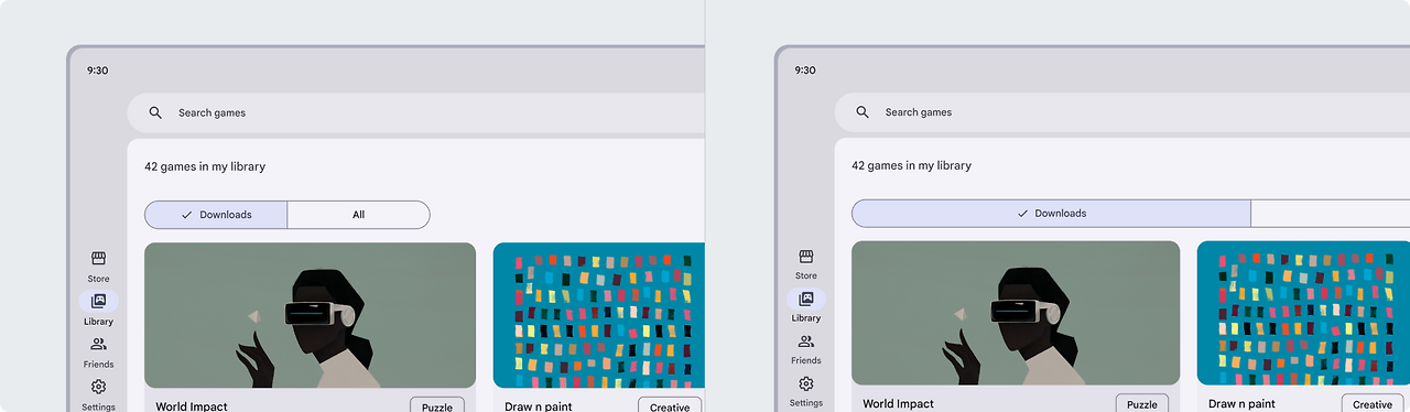 세그먼트 버튼은 프레임 가장자리로부터 적절한 여백이 있어야 합니다. 더 큰 화면이나 창의 전체 너비에 걸쳐 있는 것은 지양합니다. 이렇게 하면 세그먼트 레이블의 양쪽 패딩이 너무 많이 남아 버튼의 사용성이 떨어질 수 있습니다.