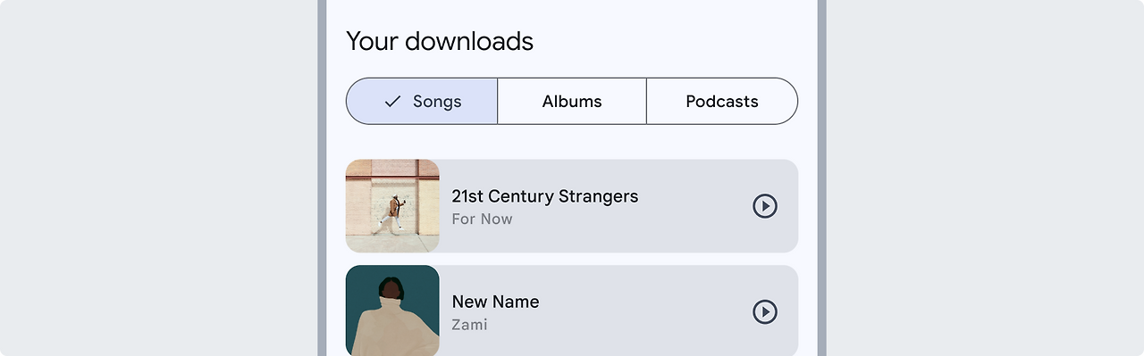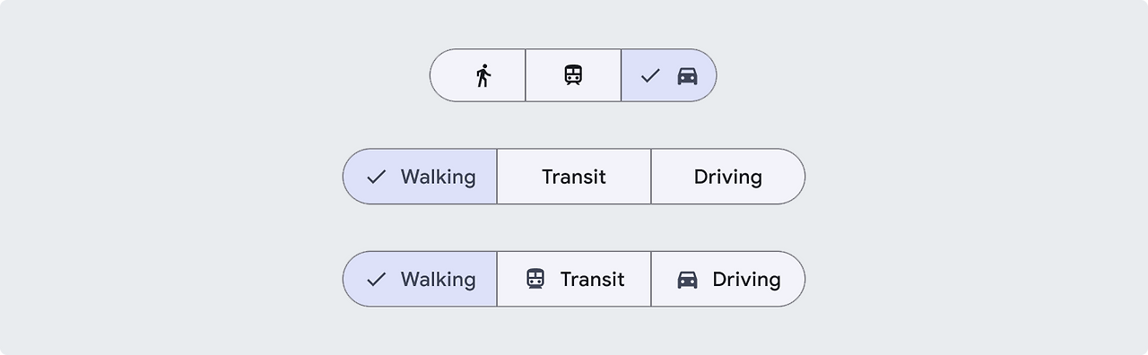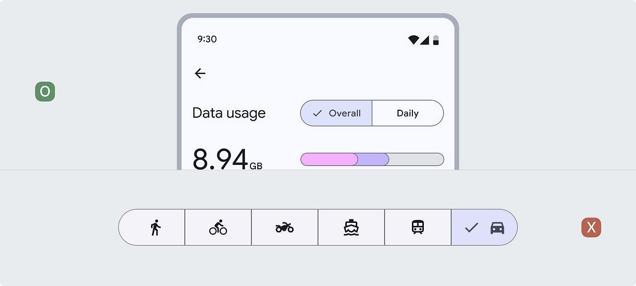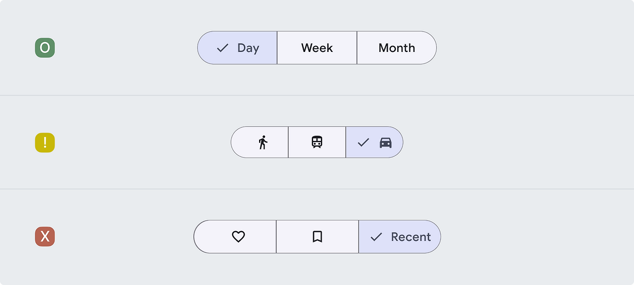 세그먼트 버튼은 2~5개의 선택사항을 선택하는데 가장 적합합니다. 단일 세그먼트 버튼에 5개 이상의 세그먼트를 사용하면 안 됩니다. 5개 이상인 경우, 칩과 같은 다른 컴포넌트를 고려해야 합니다.