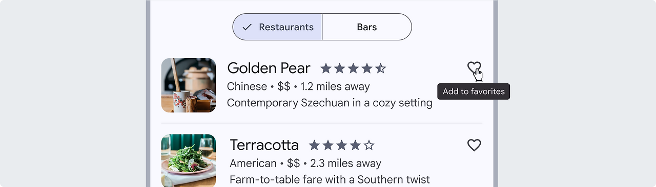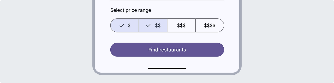 다중 선택 세그먼트 버튼은 2~5개의 옵션 중에서 선택하거나 정렬할 때 사용됩니다. 단일 선택과 달리 반드시 하나를 선택할 필요가 없으며, 사용자는 모든 옵션을 선택하거나 아무것도 선택하지 않을 수도 있습니다. 예를 들어, 다중 선택 세그먼트 버튼은 레스토랑을 검색할 때 가격 범위로 필터링하는 데 사용할 수 있습니다.