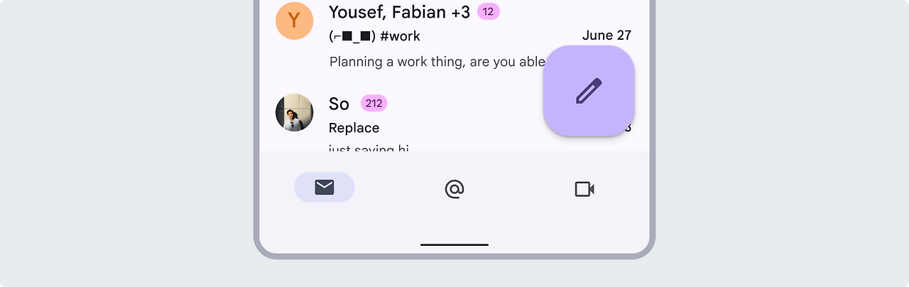 FAB의 아이콘은 명확하고 이해하기 쉬워야 합니다. 추가, 메시지 또는 편집과 같이 명확하고 간단한 아이콘을 사용합니다. 명확성을 위해 툴팁을 사용할 수 있는지 확인합니다. 제스처, 꽃과 같이 덜 일반적인 동작을 상징하기 위해 혼란스럽거나 끝이 열려 있는 아이콘은 지양합니다.