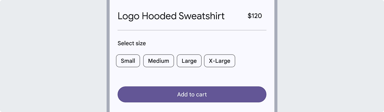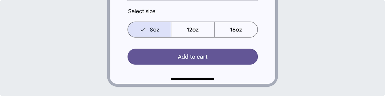 단일 선택 세그먼트 버튼은 여러 옵션 중 하나를 선택하거나, 뷰를 전환하거나, 최대 5개의 요소를 정렬할 때 사용됩니다. 예를 들어, 단일 선택 세그먼트 버튼은 음료 크기 선택처럼 특정 크기 옵션 중 하나를 선택하는 데 사용할 수 있습니다.