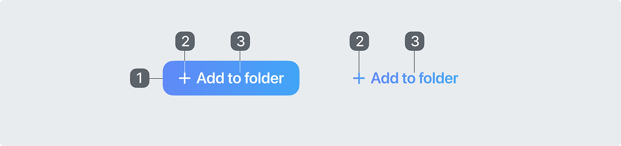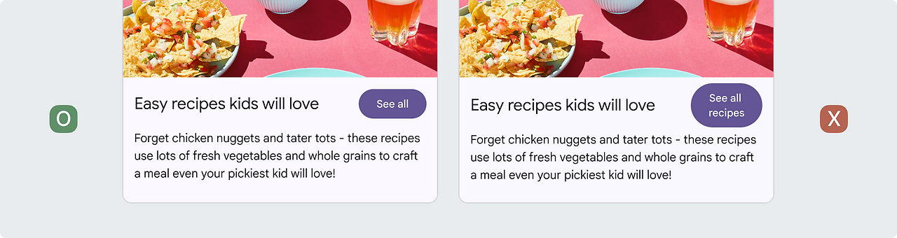 버튼 레이블 텍스트에는 문장 대문자를 사용하고 첫 번째 단어와 고유 명사를 대문자로 표시합니다. 텍스트 줄 바꿈은 지양해야 합니다. 최대한 읽기 쉽게 하려면 레이블 텍스트는 한 줄에 있어야 합니다.