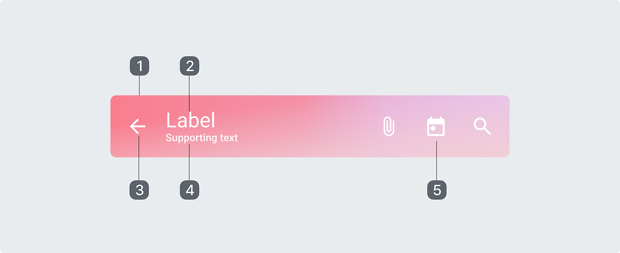 앱 바 컨테이너는 탐색 아이콘, 헤드라인, 버튼 등 화면 상단에 위치한 모든 정보와 작업을 담는 영역입니다. 컨테이너의 위치나 형태를 임의로 변경하지 않는 것이 중요합니다.