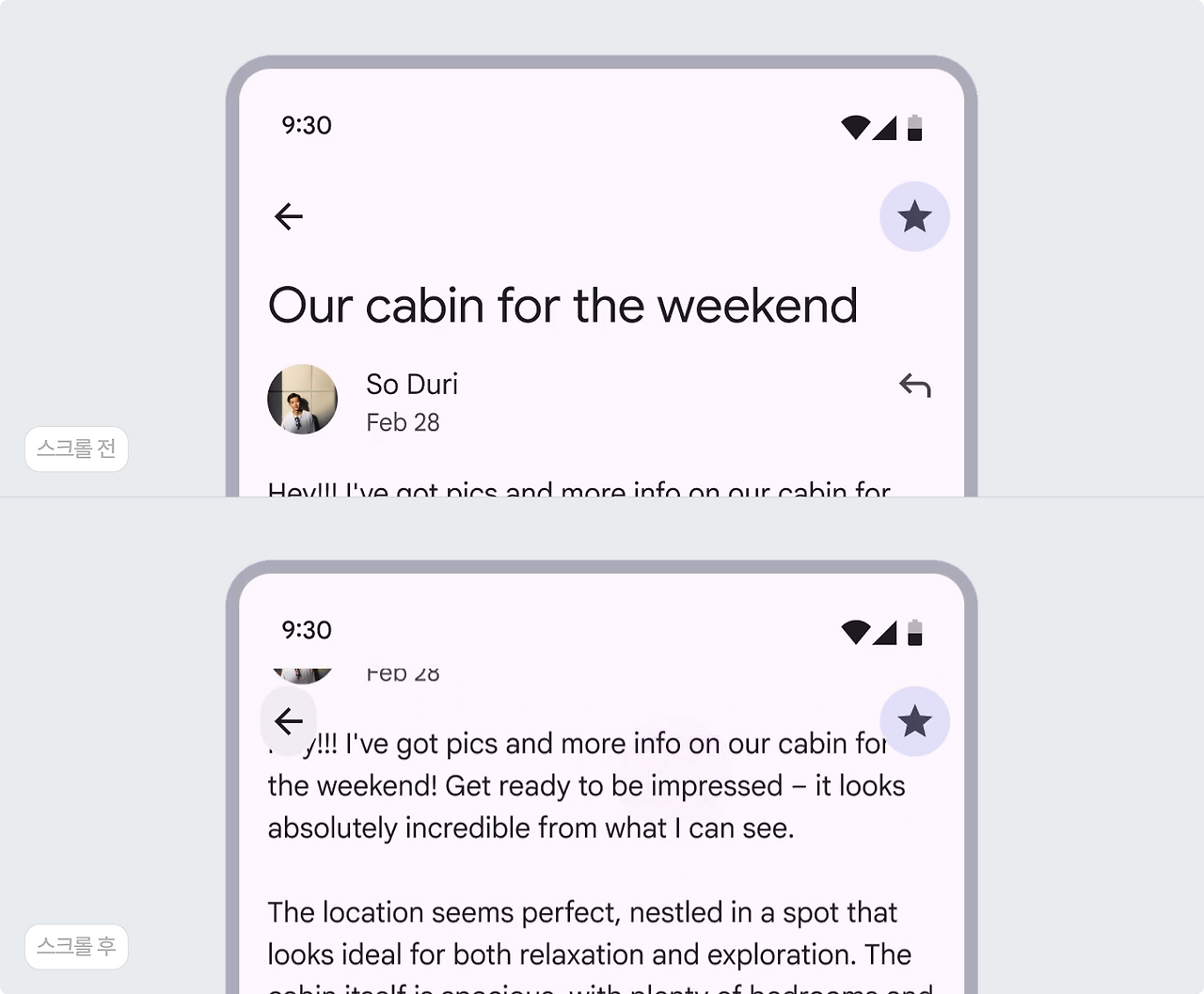 본문 콘텐츠에 더 집중할 수 있도록, 스크롤 시 앱 바 컨테이너를 투명하게 설정하는 방법을 고려할 수 있습니다. 이렇게 하면 버튼들이 콘텐츠 위에 떠 있는 형태로 표시됩니다.