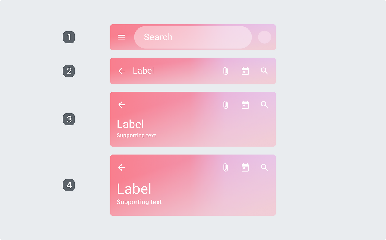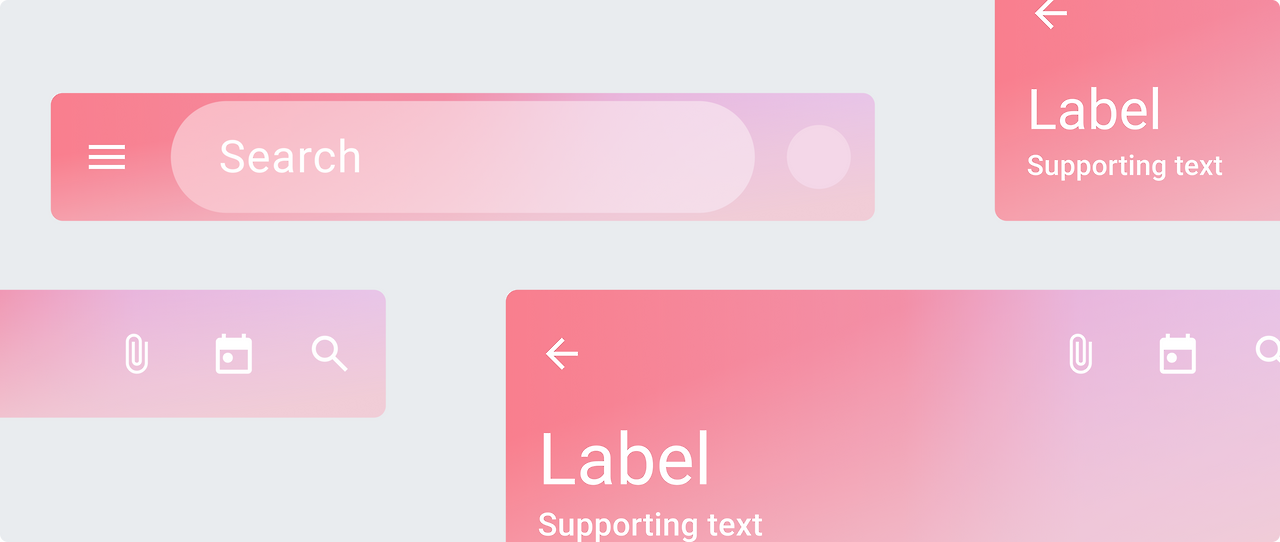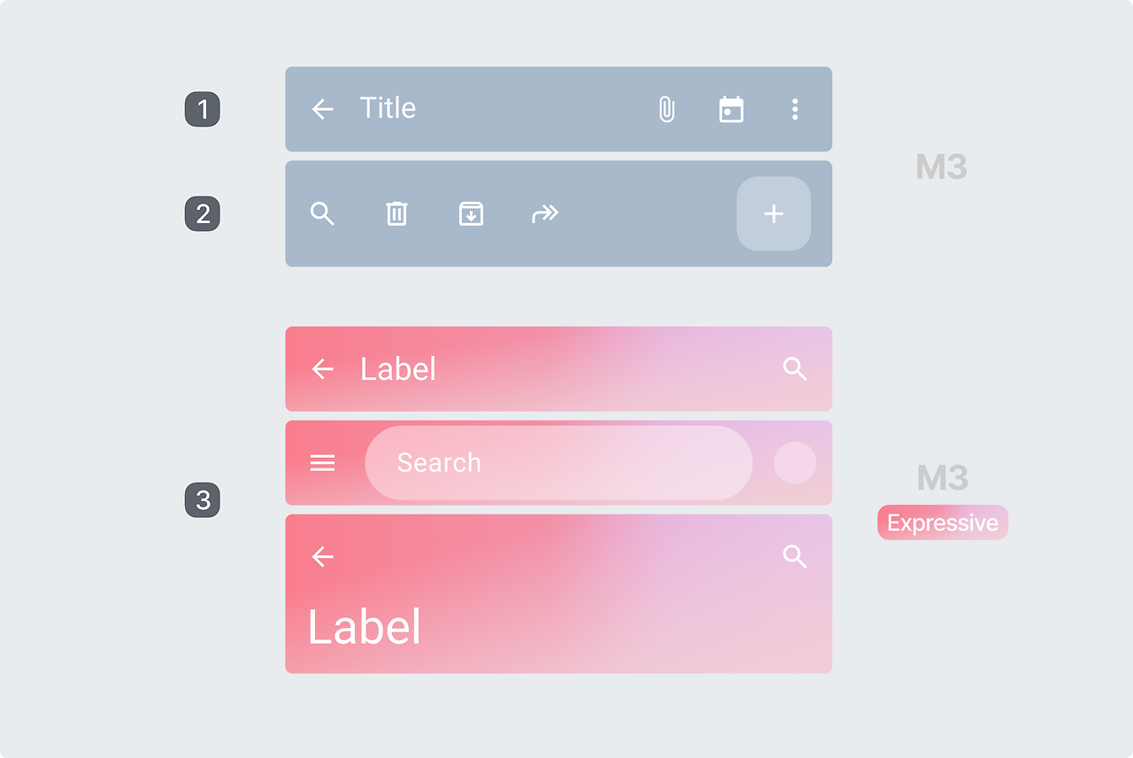 앱 바는 페이지 제목, 탐색 아이콘, 주요 작업 버튼 등을 통해 사용자가 현재 위치와 가능한 작업을 빠르게 인식할 수 있도록 돕는 핵심 컴포넌트입니다. Material 3에서는 유형별 크기와 동작을 세분화해 다양한 화면과 맥락에 유연하게 대응할 수 있도록 설계했습니다.