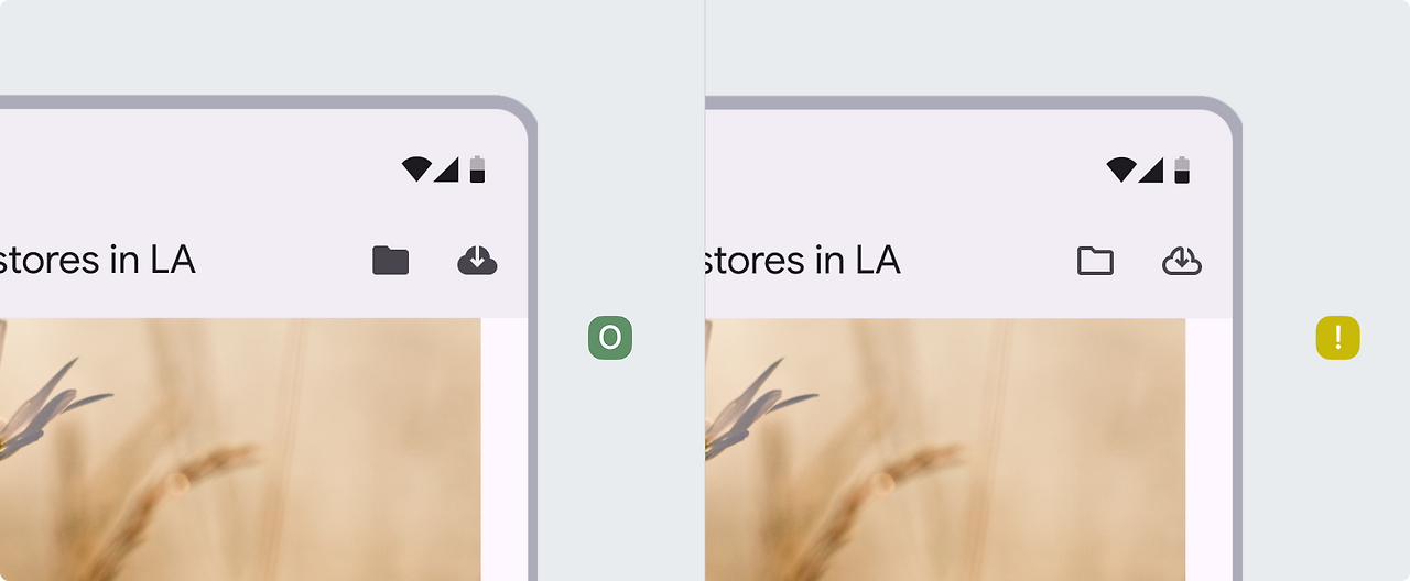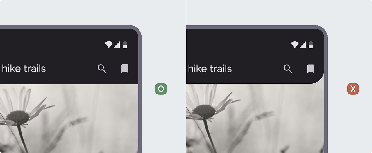 ✅ 정사각형 모서리를 사용합니다. 앱 바는 직선적인 형태를 유지해야 합니다.