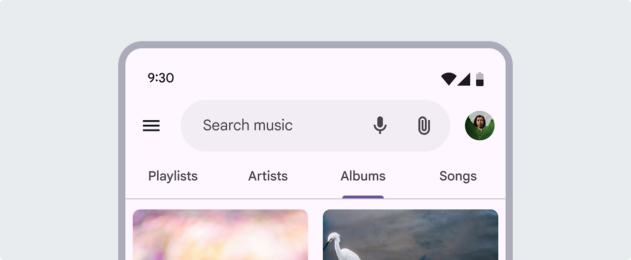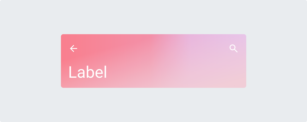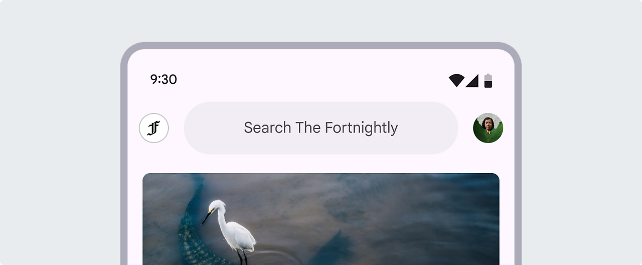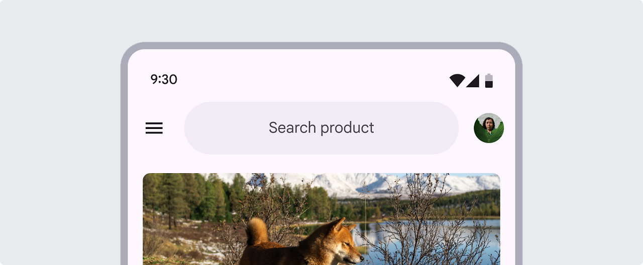 검색 앱 바는 검색 뷰를 여는 강조된 진입점으로 사용됩니다. 헤드라인 텍스트 대신 검색 필드가 포함되어 있는 것이 특징입니다.