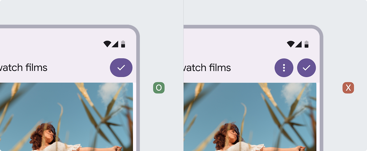 후행 아이콘 버튼은 전체 페이지에 영향을 미치는 작업을 담당해야 합니다. 작은 화면에서는 1~2개의 후행 버튼만 사용하고, 가장 자주 사용하는 작업은 선행 방향에 가깝게 배치합니다.