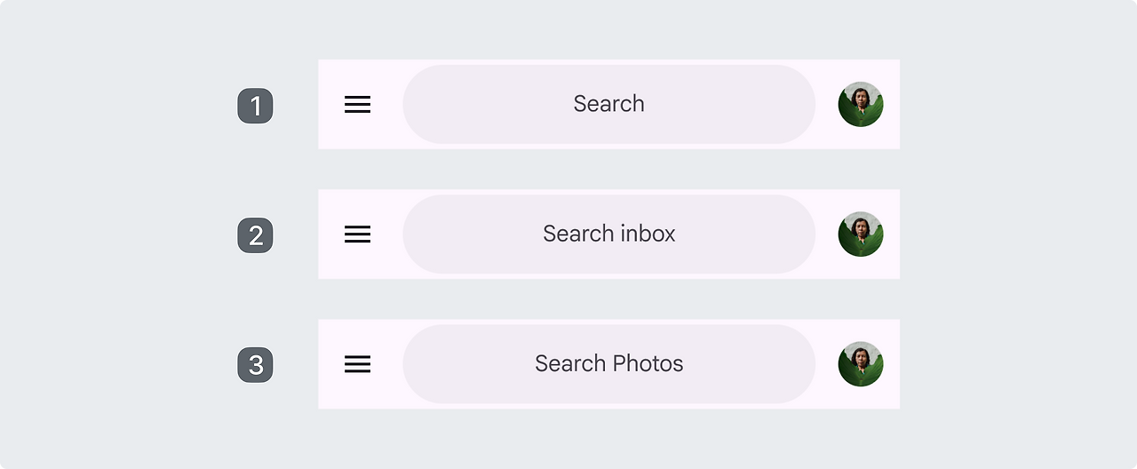 모바일 환경에서 검색 앱 바는 후행 아바타 외에 최대 두 개의 후행 아이콘 버튼을 포함할 수 있습니다. 이 아이콘들은 검색창 안쪽 또는 바깥쪽에 배치할 수 있습니다. 가장 자주 사용하는 작업은 왼쪽에, 덜 사용하는 작업은 오른쪽에 배치하는 것이 좋습니다.