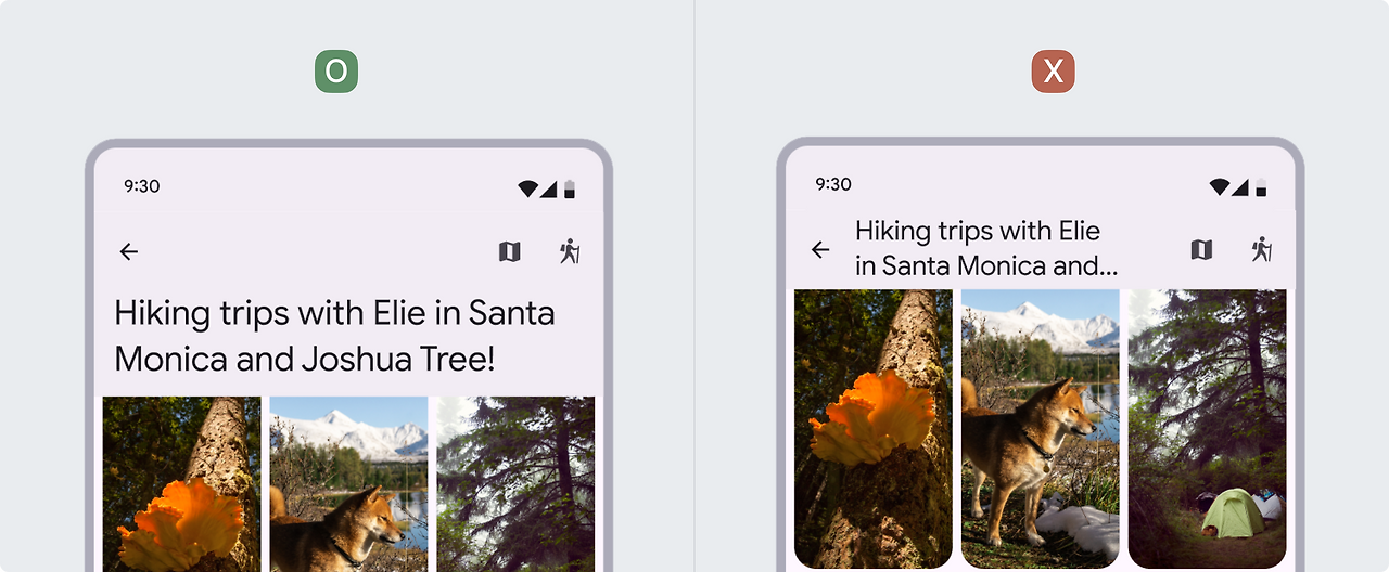 ❌ 작은 앱 바에서는 텍스트를 줄 바꿈 하지 마세요. 헤드라인 텍스트는 잘리지 않도록 해야 합니다.