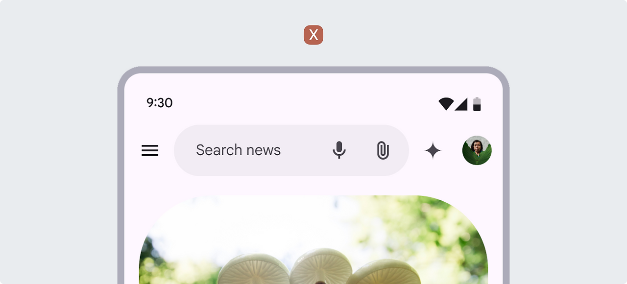 검색 앱 바의 선행 요소는 제품의 로고로 활용되어 앱의 전체적인 브랜드 경험을 강화할 수 있습니다. 이 로고는 단순한 장식일 수도 있고, 홈 화면으로 돌아가거나 새로 고침 하는 등의 동작을 트리거할 수도 있습니다. 단, 확장형 내비게이션 레일을 여는 용도로는 사용하지 않는 것이 좋습니다.