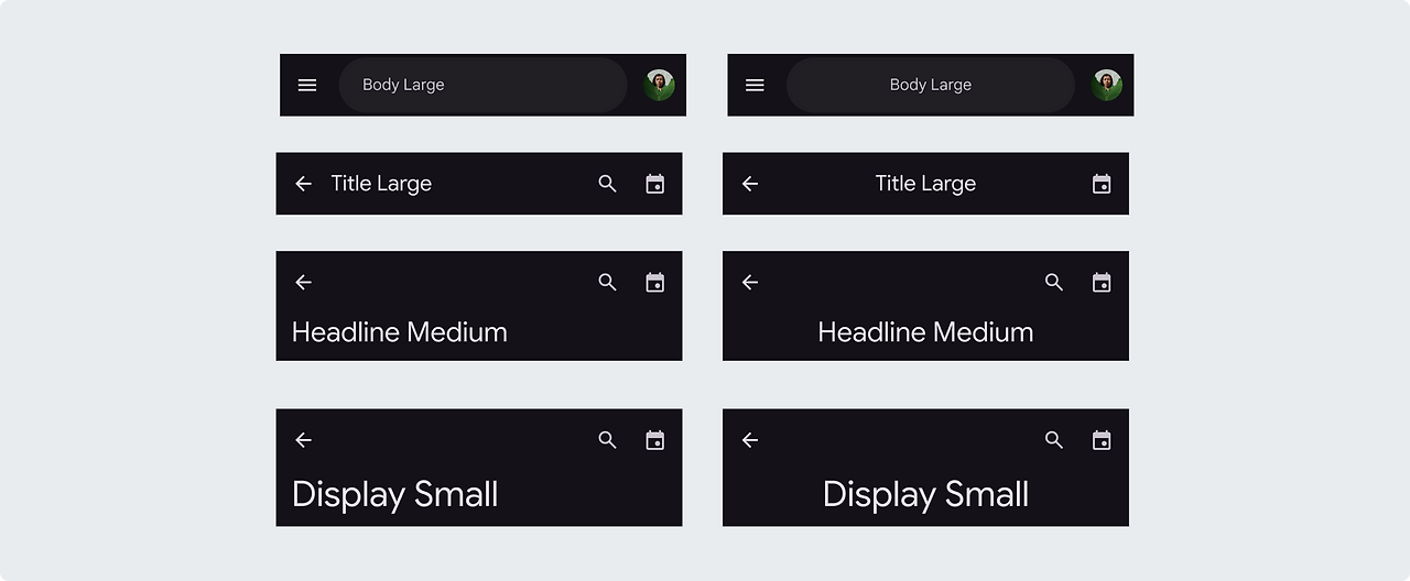 헤드라인은 선행 정렬(왼쪽 혹은 오른쪽)하거나 가운데 정렬할 수 있습니다. 헤드라인의 타이포그래피 크기와 스타일은 앱 바의 유형에 따라 달라집니다.