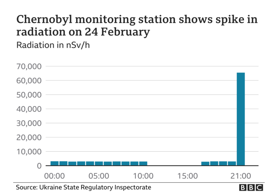 어떤 이유에서건 전쟁은 지지할 수 없다. 그 이유는 여러 가지가 있겠으나 방사능 수치를 지속적으로 감시하는 방사능 감시소의 기록은 충격적이다. 2월 24일 체르노빌 주변의 방사능 수치가 20배 증가했다고 밝혔다.