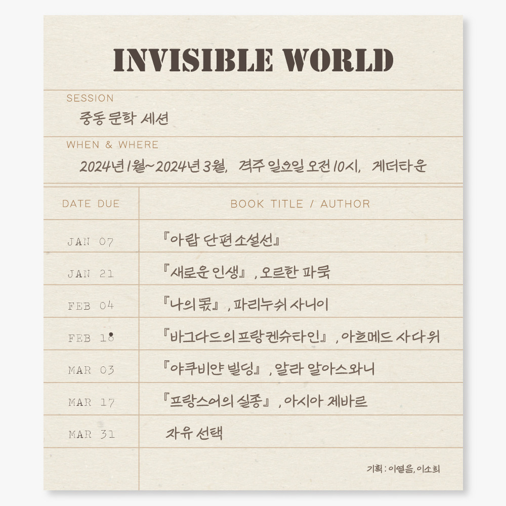 북클럽 <보이지 않는 세계들>의 중동 문학 세션이 시작되었다. <보이지 않는 세계들>은 알게 모르게 서구 지역에 한정된 우리의 문학 세상을 넓혀보자는 취지로 시작한 모임이다. 2022년 상반기의 아시아 세션, 하반기에 중남미 세션이 진행된 이후로 근 1년 만에 중동문학 세션을 진행하게 되었다.