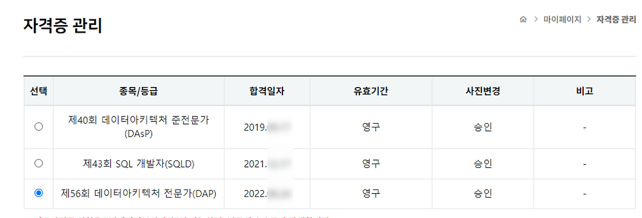 데이터 아키텍처 전문가(Data Architecture Professional, 이하 DAP) 자격증은 취득 후 1년이 지난 시점부터 보수교육을 들어야 한다. 보수교육 수강을 완료하면 자격증의 유효기간이 사라진다. 나도 얼마 전 부수교육 기간이 시작되었다. 시간 참 빠르다. 벌써 DAP를 딴지도 1년이 훌쩍 지났다니. 나는 지체 없이 보수교육을 들었다. 간단한 온라인 교육을 듣고 나니 DAP의 유효기간이 '영구'로 변경되었다.