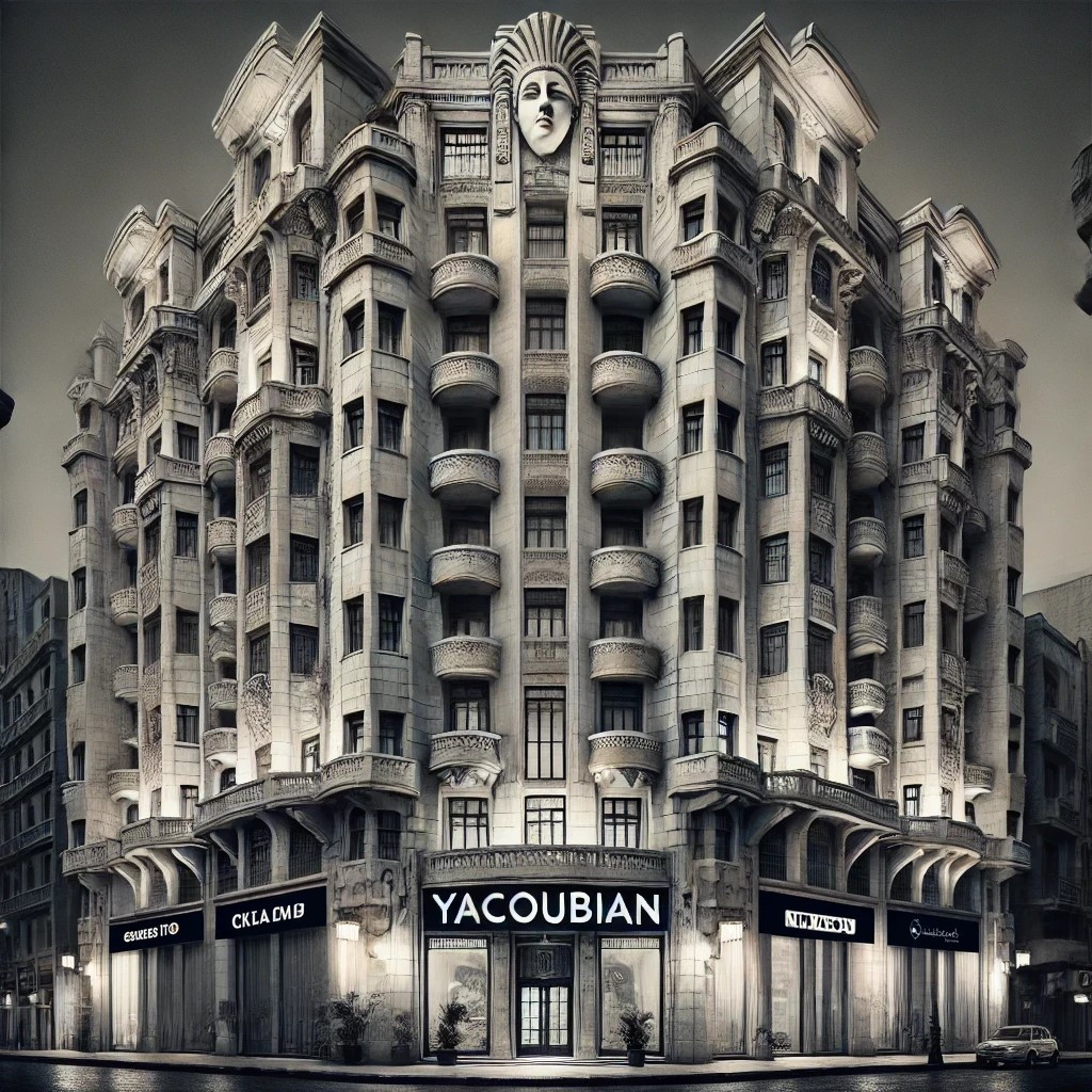 1934년 당시 이집트 내 아르메니아 교민 회장이었던 백만장자 하굽 야쿠비얀은 자기 이름을 딴 주거용 아파트를 지을 구상을 했다. (...) 그는 술라이만 파샤 가에 있는 중요 지점을 건물 부지로 택했고 공사를 위해 유명한 이탈리아의 건축 사무소와 계약을 체결했다. 그 회사는 야쿠비얀 빌딩을 고전적 유럽풍의 거대한 10층 고층 건물로 아름답게 설계했다. 발코니들은 석재로 된 그리스인 얼굴 조각상들로 장식하고 기둥들과 계단, 복도 등은 모두 천연 대리석을 사용했으며, 엘리베이터는 최신형 쉰들러 상표가 붙은 것이었다.