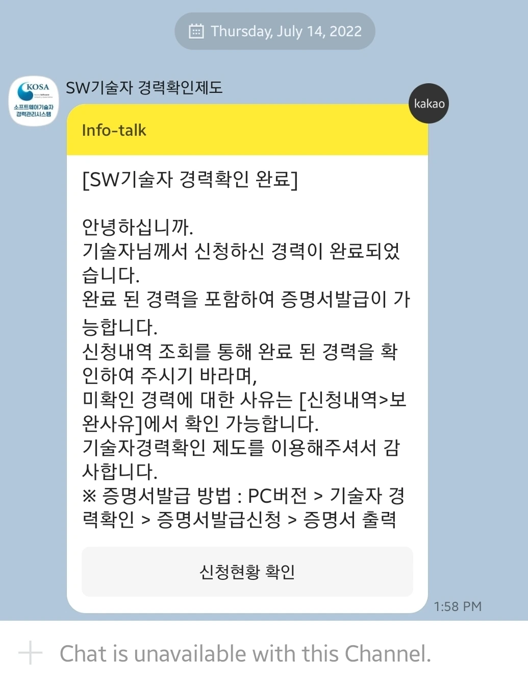 오후 2시 00분의 메시지시험 결과를 확인하고 2주가 흘렀다. 그간 증빙서류를 제출해 응시자격 검증을 받았고 합격이 확정되어 자격증을 출력했다. 출력한 자격증은 SW기술자 경력관리시스템에도 등록해서, 오늘 승인 결과까지 받았다. 이제 정말 내 것이 된 자격증인데 아직도 얼떨떨하기만 해서 주변에 알리지도 못했다. 팀장님께도 취득 사실을 함구하고 있는 상태다. 어쩐지 입이 떨어지지 않는다. 모든 근거 문서가 YES라고 말해주는데도 내 마음이 받아들이지 못하고 있다.