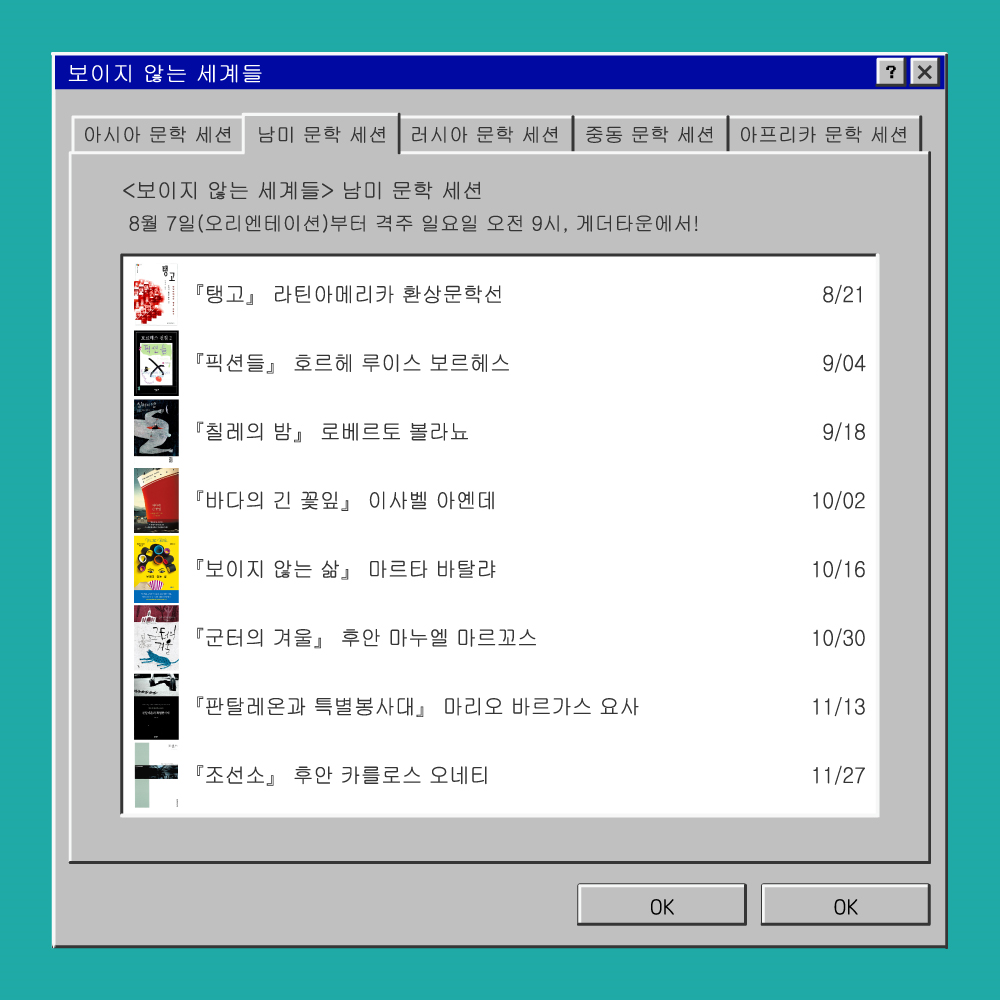 모임 초대에 필요한 모든 것(일시, 장소, 책)이 정해지기 무섭게 열음님은 모임 대표 이미지를 만들었다. 여덟 권의 책을 두 달간 함께 읽자는 이야기가 이렇게 시각화되고 나니, 참 새롭고 반가웠다. 나는 지체 없이 주변에 관심을 가지고 있을 만한 소수의 사람들에게 모임 계획을 알렸다. 아시아 문학 세션 이야기를 주변에 했을 때, 중남미 세션이라면 참여해보고 싶다는 친구들이 몇 있었기에 기대가 되는 초대였다. 그러나 나의 설렘도 잠시. 상반되는 두 가지 이유로 모두 참석이 불발되었다. 첫 번째 이유는 읽어야 할 책이 너무 많아서였고, 두 번째 이유는 읽어야 할 책이 너무 적어서였다. 첫 번째 이유를 가진 친구들은 평소 독서를 즐기며 생활하던 것은 아니라서 2주에 한 권씩 여덟 권이란 책을 읽기를 몹시 우려하고 두려워했다. 반면에 두 번째 이유를 가진 친구들은... 이미 읽은 책이 많다며 거절했다. ㅋㅋㅋㅋ.... 저기... 중간은 없니..?