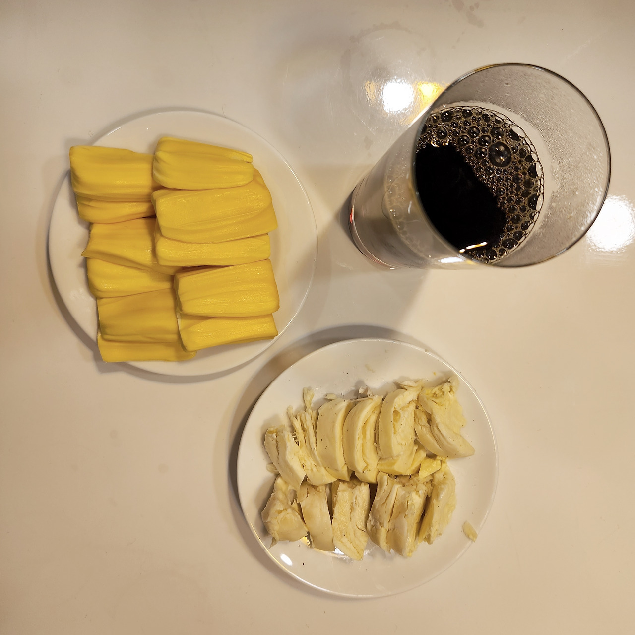 잭 프루트는 항상 손질된 것만 봐왔어서 본체가 20kg가 넘는 육중한 과일이라는 걸 얼마 전에 알았다. 손질된 과육 안에 큼직한 씨앗이 자리 잡고 있어서 나는 늘 반으로 쪼개 씨앗을 발라놓고 먹는다. 잭 프루트의 맛을 묘사하자면 문방구 풍선껌과 같은 맛인데, 이렇게 말하면 문방구 세대가 아닌 사람들은 못 알아들을까? 식감도 살짝 풍선껌을 닮았다. 약간 푹신한 듯 쫄깃하다. 커피와의 합도 꽤나 좋은데 상큼한 성질이 강해서 역시나 다크 로스팅한 커피와 더 잘 어울린다. 산미가 있는 커피와는 잭 프루트와 커피 모두가 어쩔 줄 몰라하는 맛이 된달까.