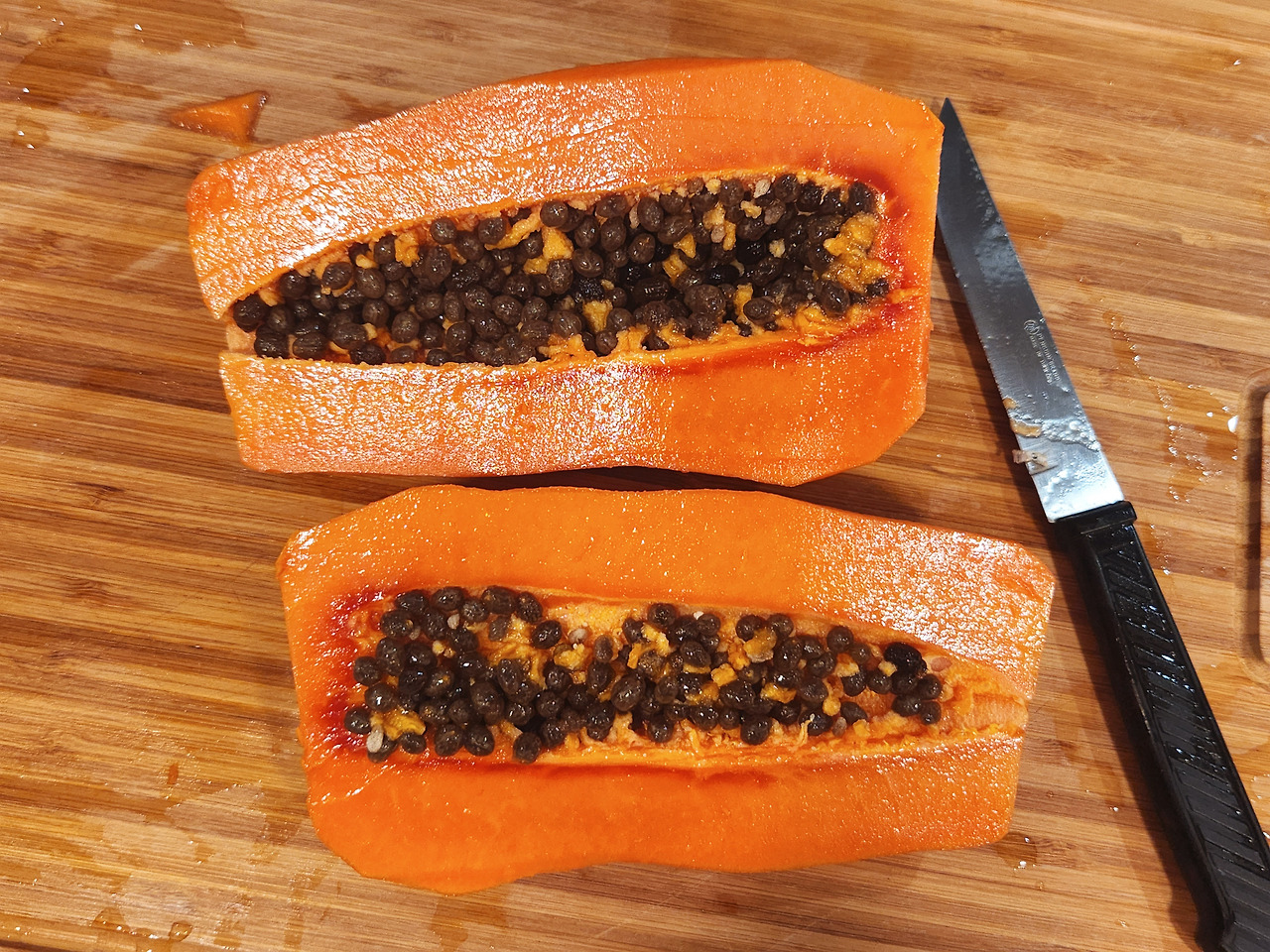 파파야가 내게 맛있는 과일로 자리매김한 것은 멕시코에 있을 때였다. 친구네 어머니가 깎아 내어 주신 파파야가 그렇게 시원하고 달고 맛있을 수 없었다. 가끔 식사 때는 파파야 물(Agua fresca de papaya)을 몇 리터씩 만들어 끝도 없이 채워주시곤 했었다. 그렇게 잘 익은 파파야의 맛을 알게 된 나는 종종 파파야를 한 통 사서 직접 손질해 먹기도 했는데, 어렸던 그때는 무작정 아무렇게나 숭덩숭덩 잘라낸 뒤 씨를 하나하나 골라내느라 주방을 늘 난장으로 만들었던 기억이 난다. 이제는 숙련된 파파야 기사가 되어서 껍질 까기는 물론이고 씨 바르기도 훌륭하게 잘한다. 씨 한 알 놓치지 않는다고.