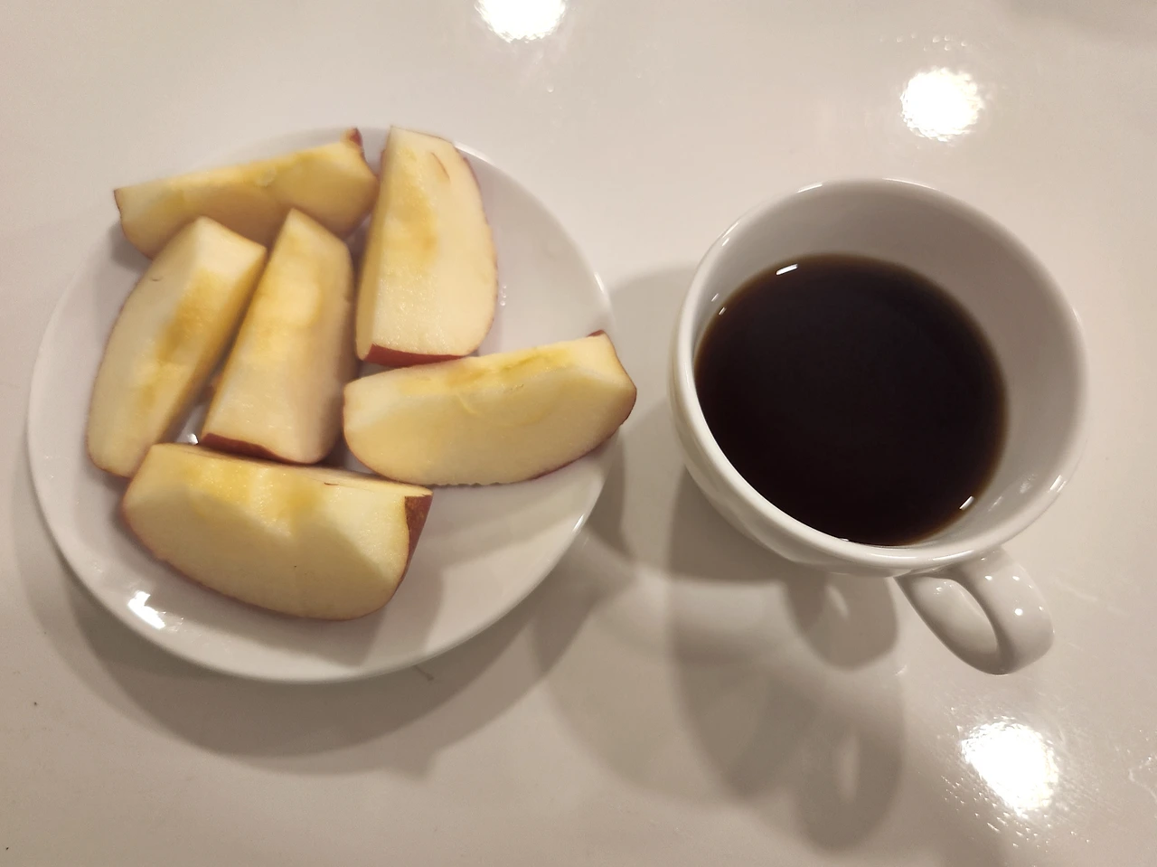 아침에 사과 한 알을 먹는 게 건강에 좋다는 말이 있다. 식습관에 있어서 건강보다는 맛과 즐거움부터 따지는 나에게 사과는 꽤 도전적인 선택이다. 시나몬이 살짝 들어간 달짝지근한 애플파이와 아메리카노의 조화야 환상적이지만 생사과와 커피는 두근거리는 조화는 아니지 않나? '아삭'이라는 소리조차 따끈하고 어두운 커피와는 대조적으로 필요 이상으로 경쾌한 느낌이다.