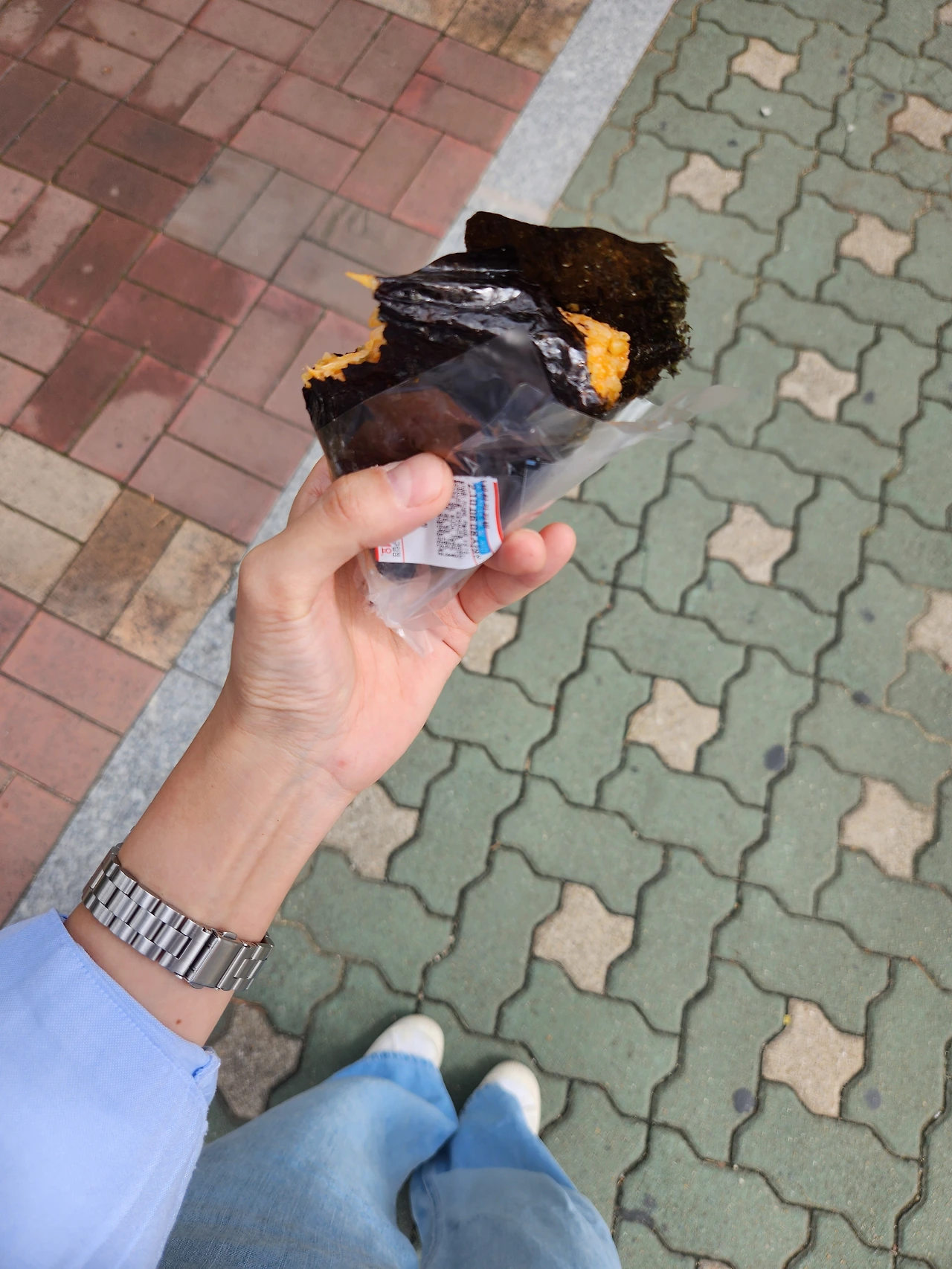 그렇게 한 70%의 완성도로 마무리된 출근용 몸뚱이를 끌고 지하철을 탔고, 내려서는 삼각김밥을 먹으며 회사로 달려갔다.