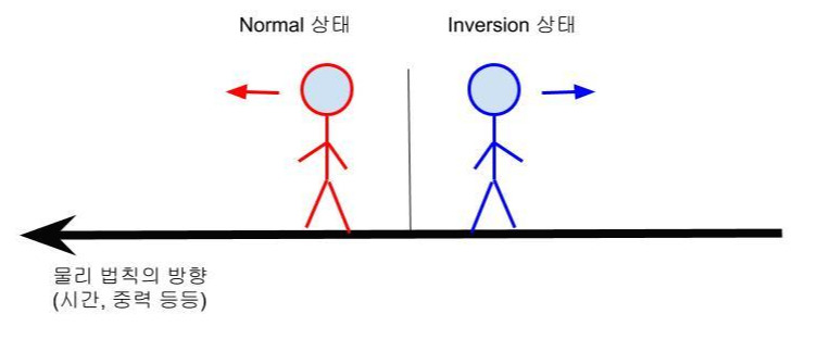 가장 중요한 세 번째 개념은 인버전(Inversion)이다. 이 영화를 제대로 이해하려면 영화 속에 언급되는 이 개념을 분명하게 이해하고 봐야 한다. 인버전이란, 쉽게 말해서 반대로 되는 것을 뜻한다. 영화 속에서는 엘리베이터 같은 특정한 장치를 통해 인버전 상태로 변하는데, 이 상태에서는 모든 물리 법칙이 거꾸로 작용한다. 중력도 반대로 작용하고 시간도 거꾸로 흐르고, 모든 물리 법칙이 반대로 작용하기 때문에 인버전 된 상태의 총알에 맞아 생긴 상처도 일반적인 경우와 다른 경향을 나타내 치료가 어렵게 된다. 물론 인버전을 두 번 하게 되면 다시 Normal 상태로 돌아오게 된다. 중요한 점은 인버전 장치를 통해서 특정한 과거 시점으로 순간이동하는 것이 아니라 장치를 통과하는 그 순간부터 시간이 거꾸로 흐르게 되는 것이다.