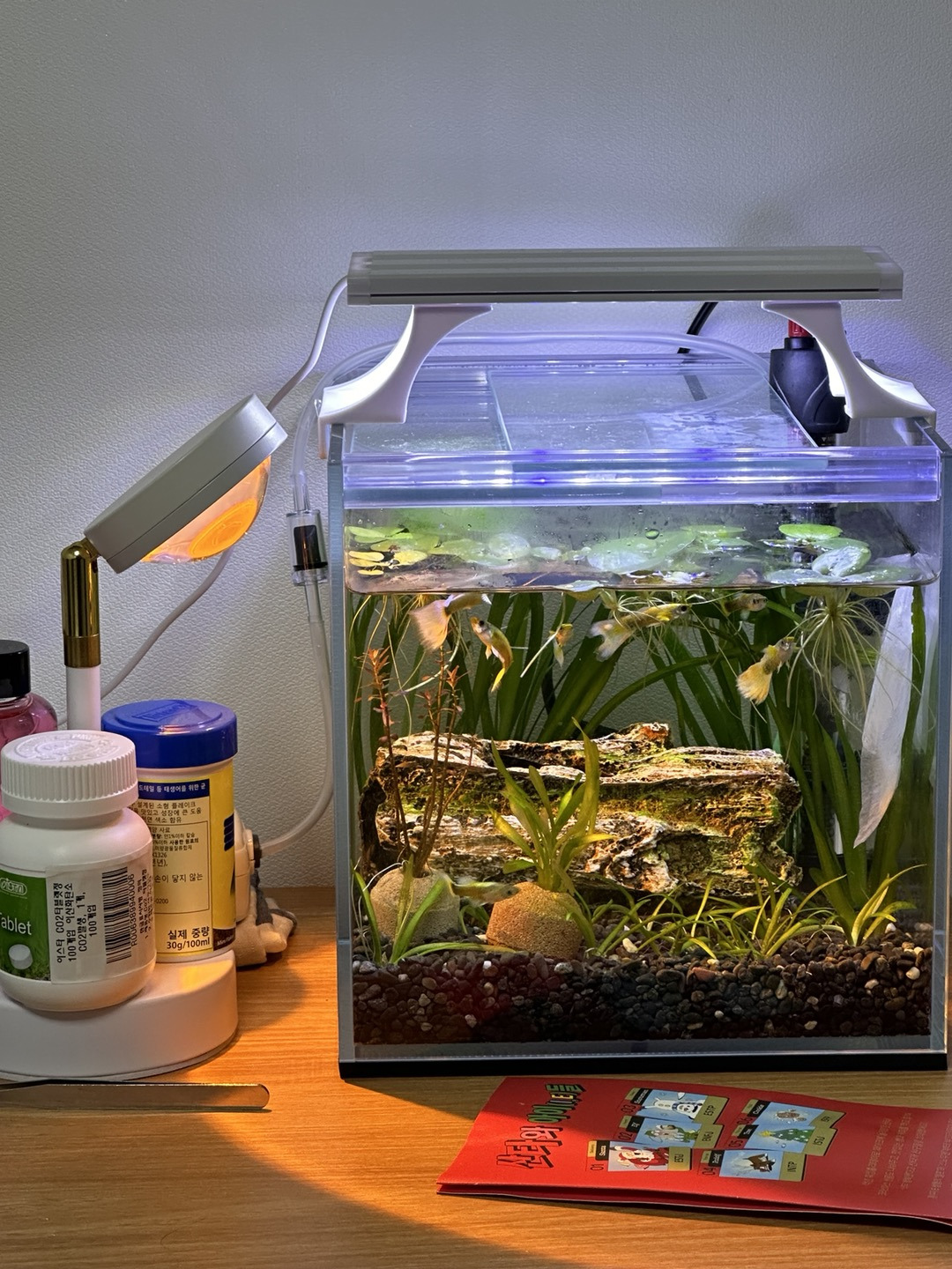 방을 새로 구하면서 20큐브 어항으로 물생활(물고기를 기르는 취미)을 시작했다. 수초를 조금 심고 야마토 새우 2마리와 웬만해선 잘 안 죽는다는 구피 7마리를 데려와서 어항에 넣고 나니, 텅 비어있던 어항이 그제서야 조금 볼만해졌다. 또 하나의 생태계를 조성해놓은 느낌이었다.