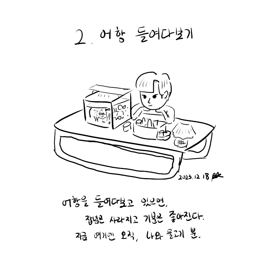 어쩌면 마음 속에 강한 물살이 내리치고 있는 순간에도 어항 속 세계를 바라보고 있노라면 강한 물살은 어느새 어항 물처럼 잠잠해지고, 모든 생각도 바닥에 가라앉기 때문일지도 모른다. 그래서 항상 머릿 속이 복잡하거나 걱정이 많아지면 어항을 들여다 보는 것일지도. 어항을 통한 마음의 정화인가.