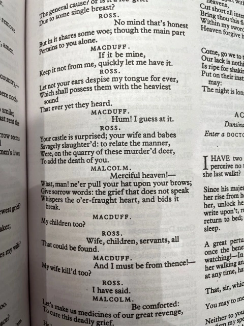 무슨 소리인지 구구절절 설명하느니 사례를 들어 설명해보겠다. 맥베스의 4막 2장에서 레이디 맥더프와 그 아들 한 명이 맥베스가 보낸 자객에 의해서 잔인하게 살해당한다. 그런데, 바로 그다음 장인 4막 3장에서 잉글랜드에 머물고 있던 맥더프가 자기를 찾아온 로스에게 가족들의 안부를 묻는데, '나의 모든 아이들은 무사한가?'(IV, iii, 177)라고 묻는다!!! 그리고, 잠시 머뭇거리던 로스가 결국은 실토하게 된다. 맥더프의 모든 가족들이 맥베스에게 몰살당했다는 사실을 말이다. 이때 로스도 분명하게 말한다.
