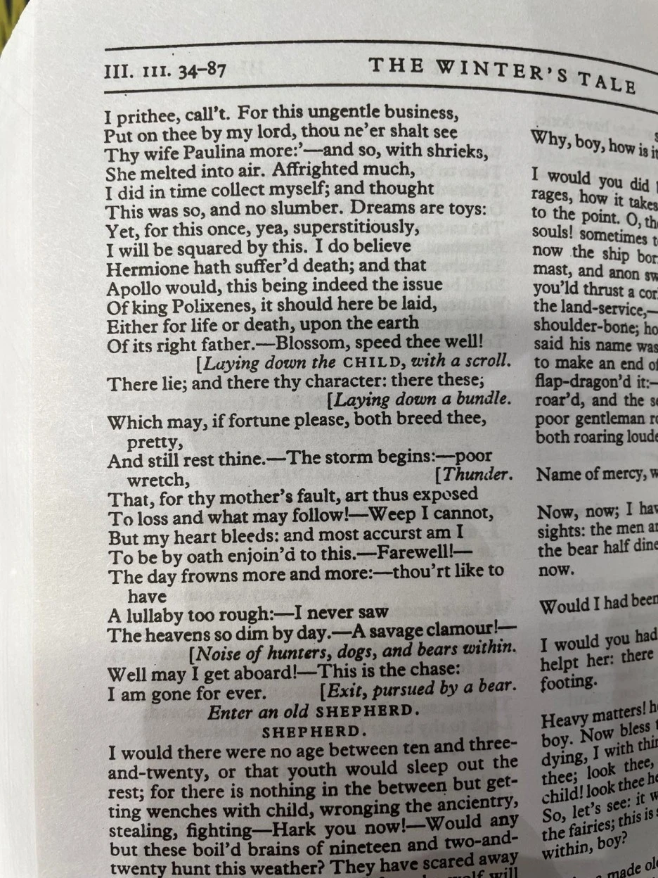 농담이 아니다. 나 지금 매우 진지한 궁서체이다. 실제로 대본에도 "Antigonus : [Exit, pursued by a bear.]"라고 쓰여 있다. 못 믿으실까 봐 사진으로 찍어서 보여드리고자 한다. 사진의 밑에서 10번째쯤 되는 줄을 보시기 바란다.