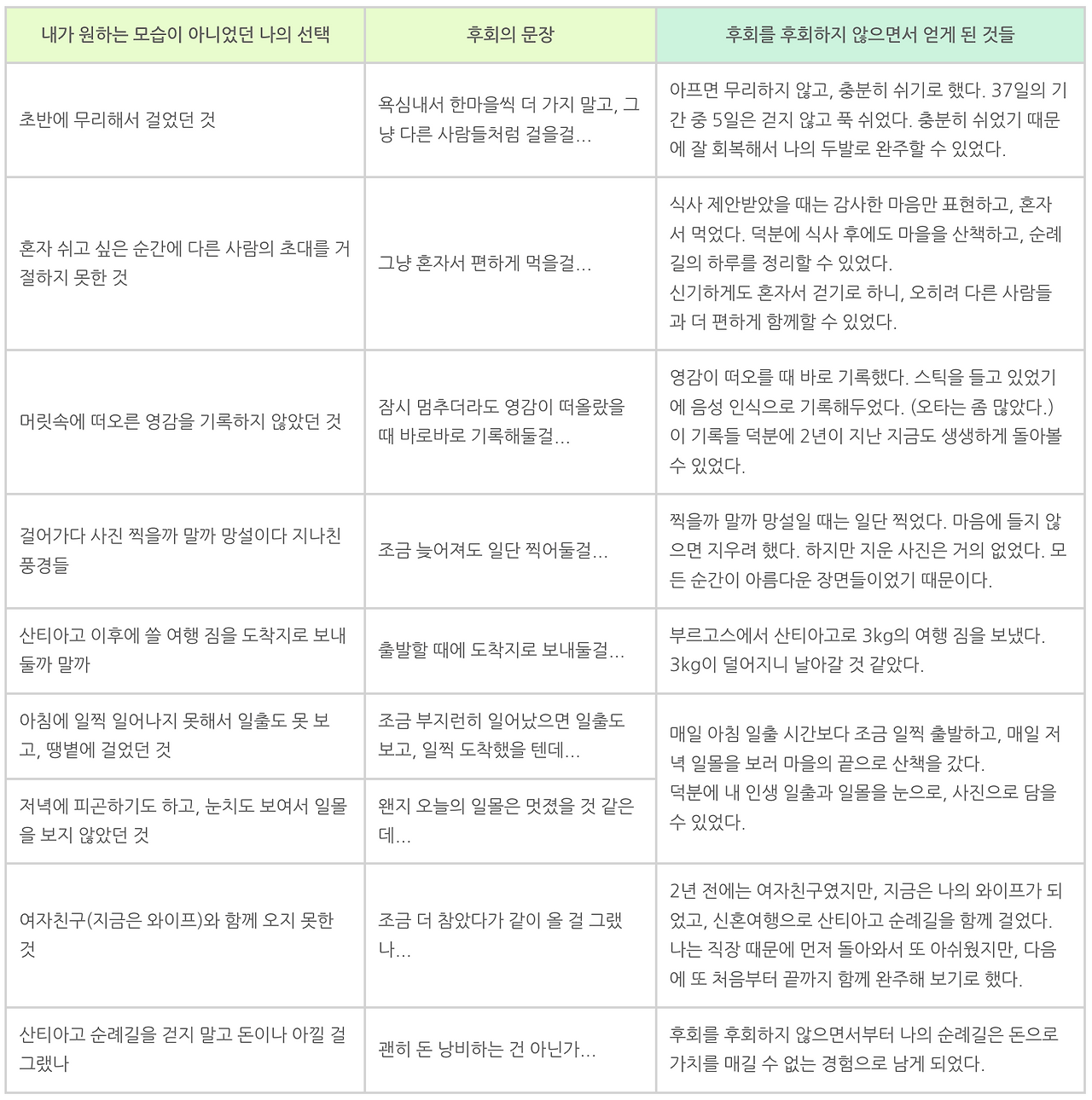 후회하지 않기 위한 선택을 하기 시작하니, 한 번 후회한 것들이 생기면 바로 내가 하고 싶은 것을 하기로 했다. 앞서 후회한 순간들을 다시 후회하기 위해 선택하니, 후회보다는 즐거움이 가득한 순례길로 바뀌었다.