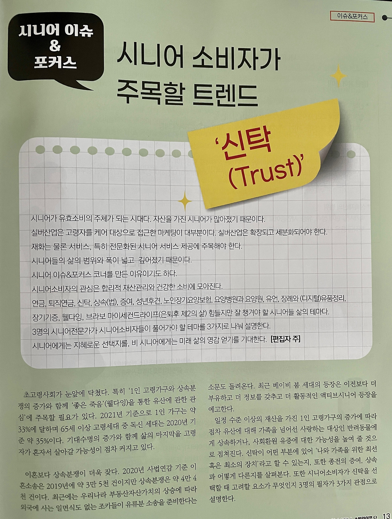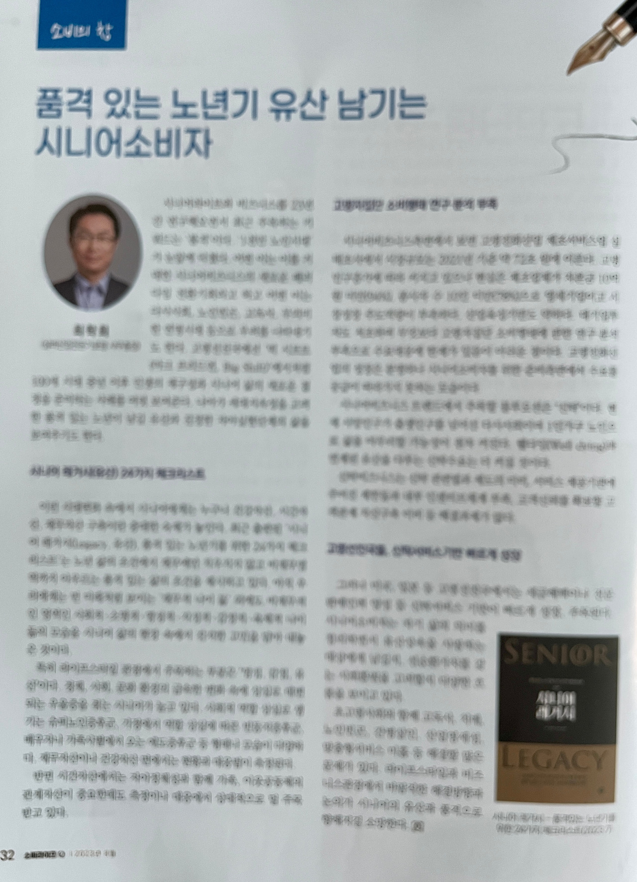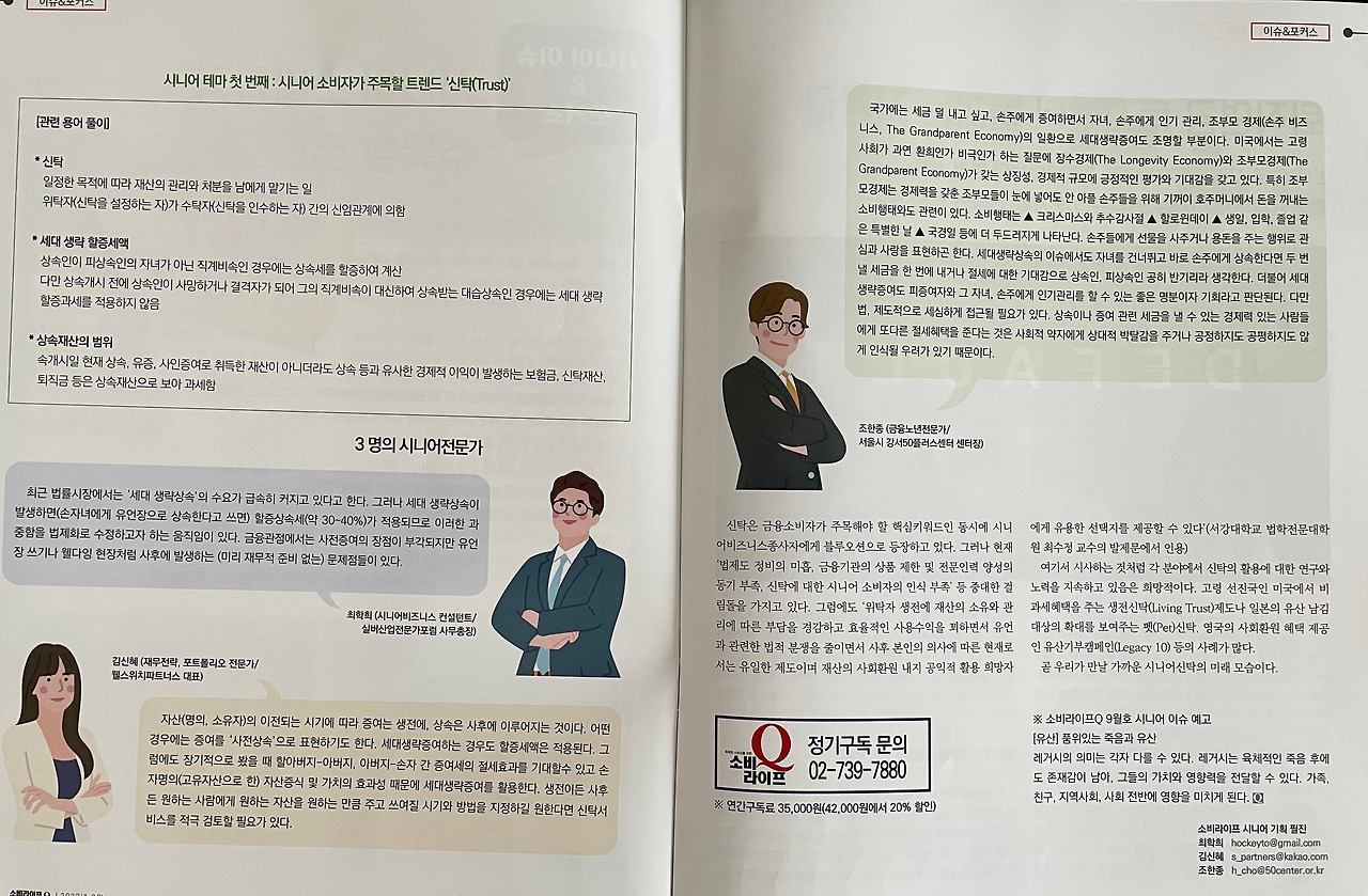 시니어 금융소비를 전문적으로 다루는 정기간행물에 ‘시니어레거시’ 공저자가 함께 했다.